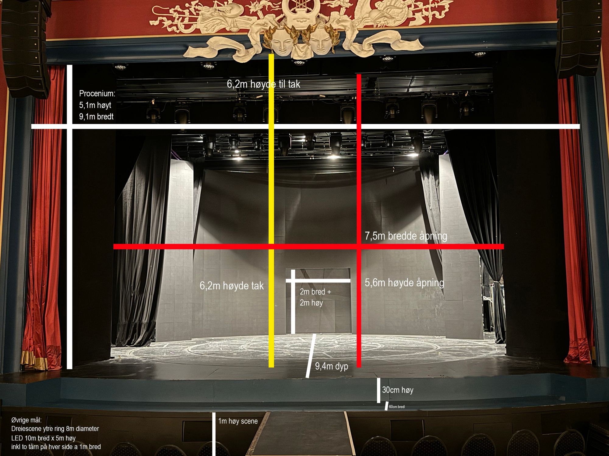 - Takhøyde scenehus: 6,2m